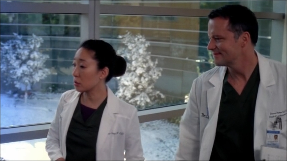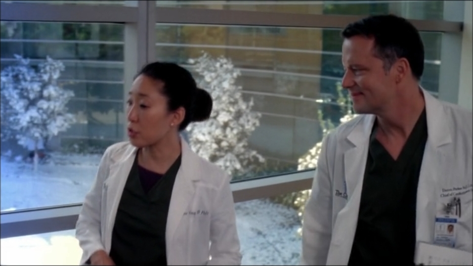 Cristina catches a ride from her pal Dr. Thomas when her car is buried under a mountain of snow. We'll call the old guy her "carpool buddy." He's not to be confused with her "sex friend." That would be the Mayo Clinic's head of cardio, Dr. Parker. Cristina's sex friend has been striving to get her carpool buddy to retire for some time now. But Dr. Thomas isn't going anywhere without a fight. He's also planning to take out a huge aneurysm around a woman's heart. Cristina is psyched to scrub in with him.