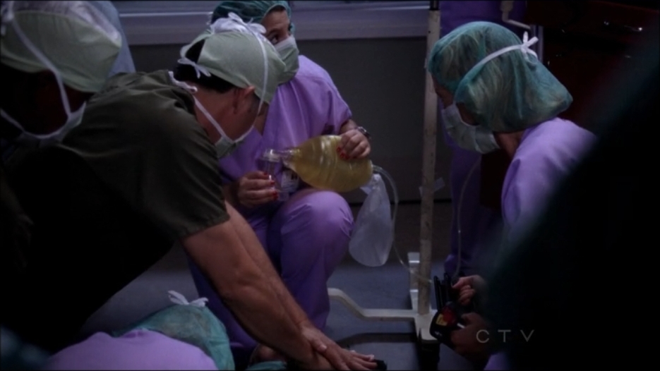 As Cristina and Thomas finish up things are going well until Thomas becomes unresponsive and looks up at her with wide eyes as he falls back and passes out. MR. FEENY?! But on another note – what is the procedure for that? As Cristina tries to save Katie, Thomas is on the floor. No pulse, shocking him isn't working, and Parker comes in to start CPR.